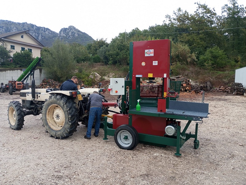 MODELLO SEGA A NASTRO SEMIAUTOMATICA 800 C.S.O.I.E.T. SUPERMATIC CARRELLATA CON SPACCALEGNA IDRAULICO 20 TONNELLATE ORIZZONTALE