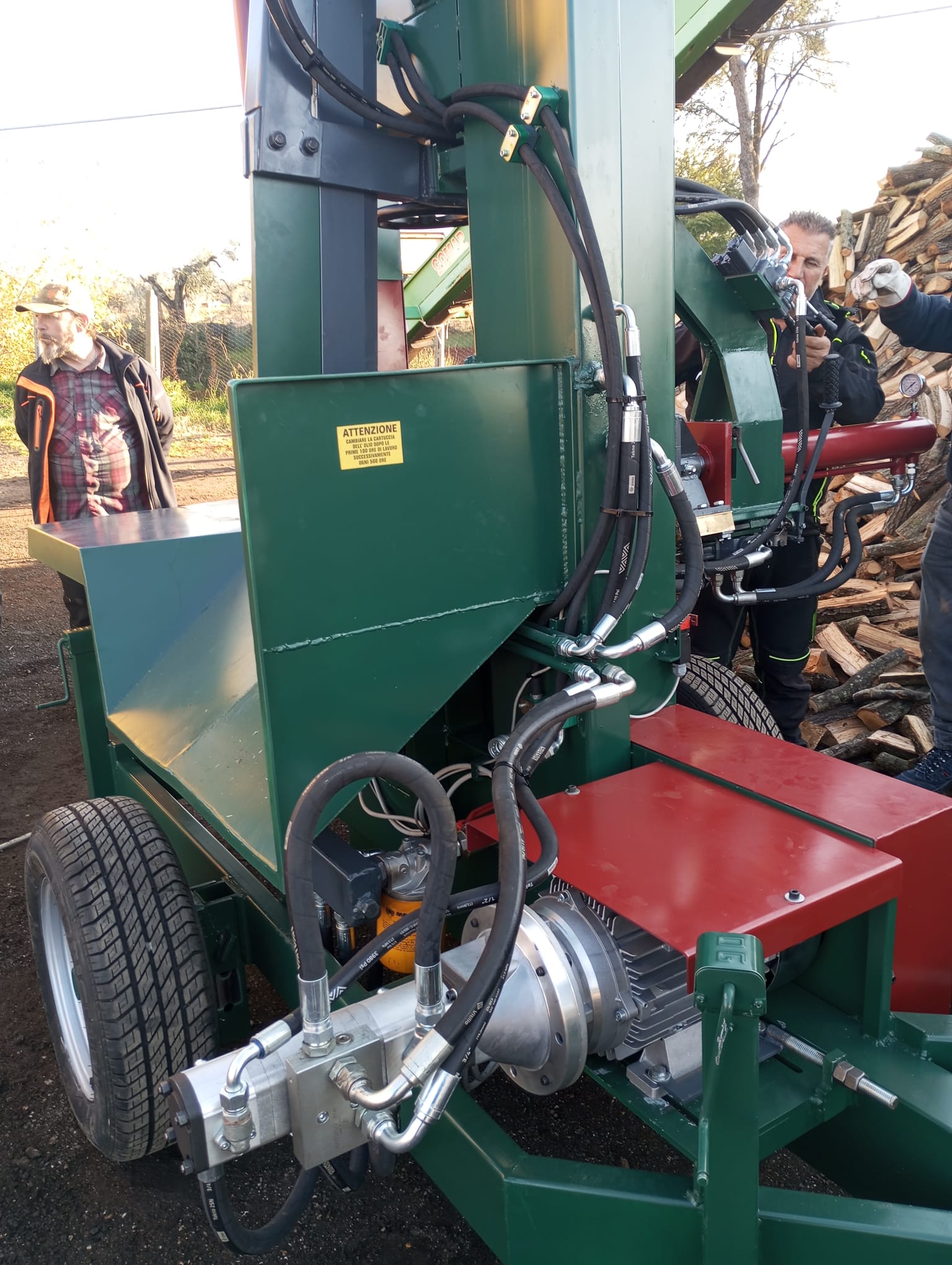 Il suo sistema di lavoro semiautomatico garantisce la produzione di circa 35 quintali di legna all'ora e permette a una sola persona di avere la massima efficienza produttiva tagliando e spaccando la legna allo stesso tempo.